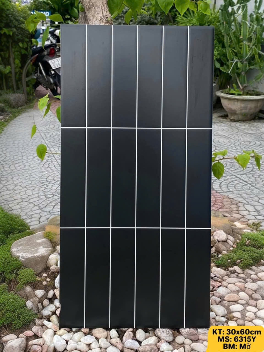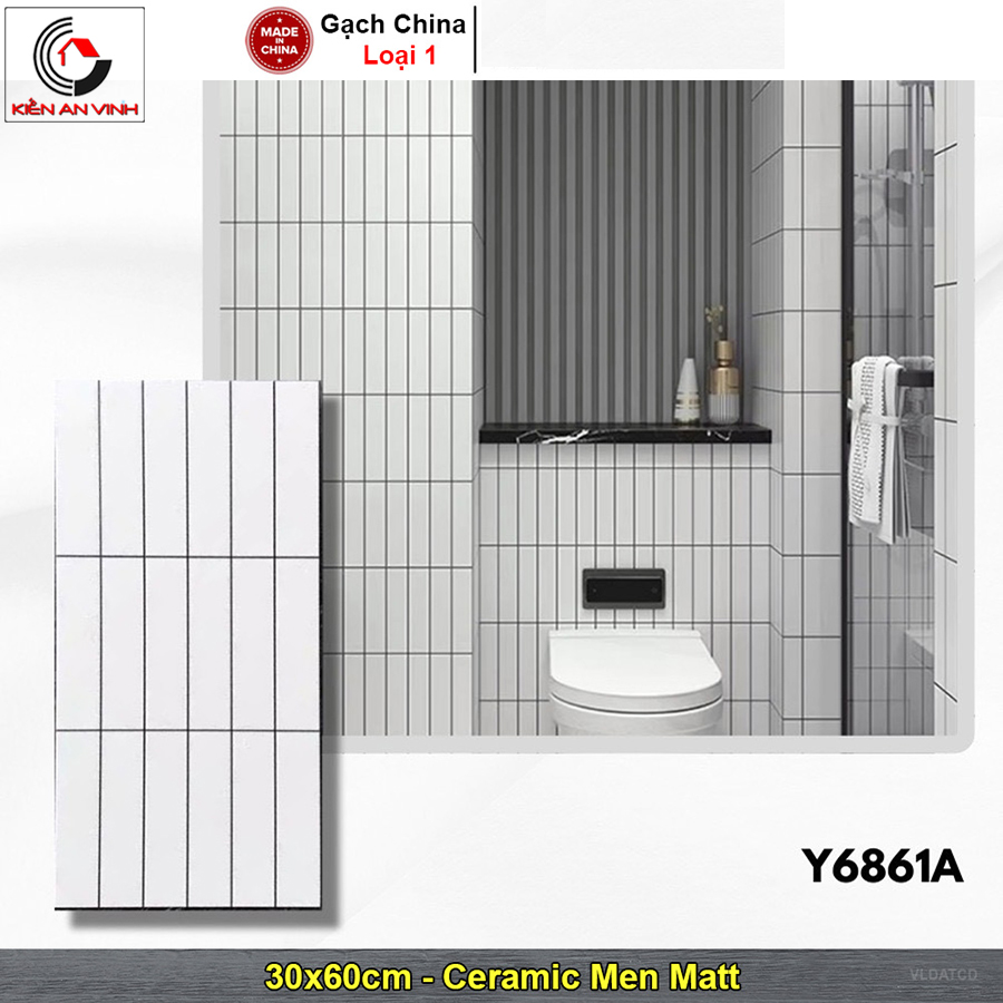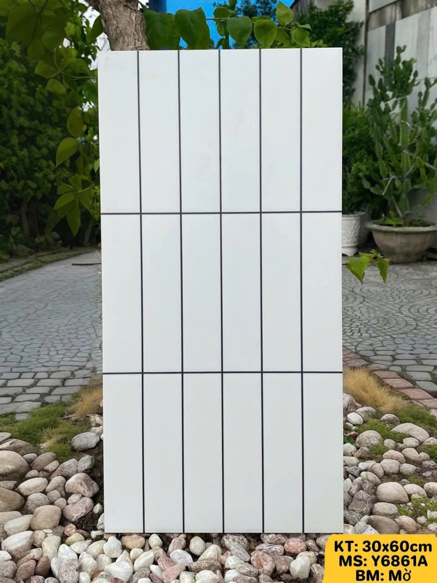 | Họa tiết | Màu Trắng với thiết kế giả gạch thẻ/gạch chữ nhật đứng nhỏ (thông thường là 3 hàng gạch thẻ 10x60 cm trên viên 30x60 cm) với ron đen. |