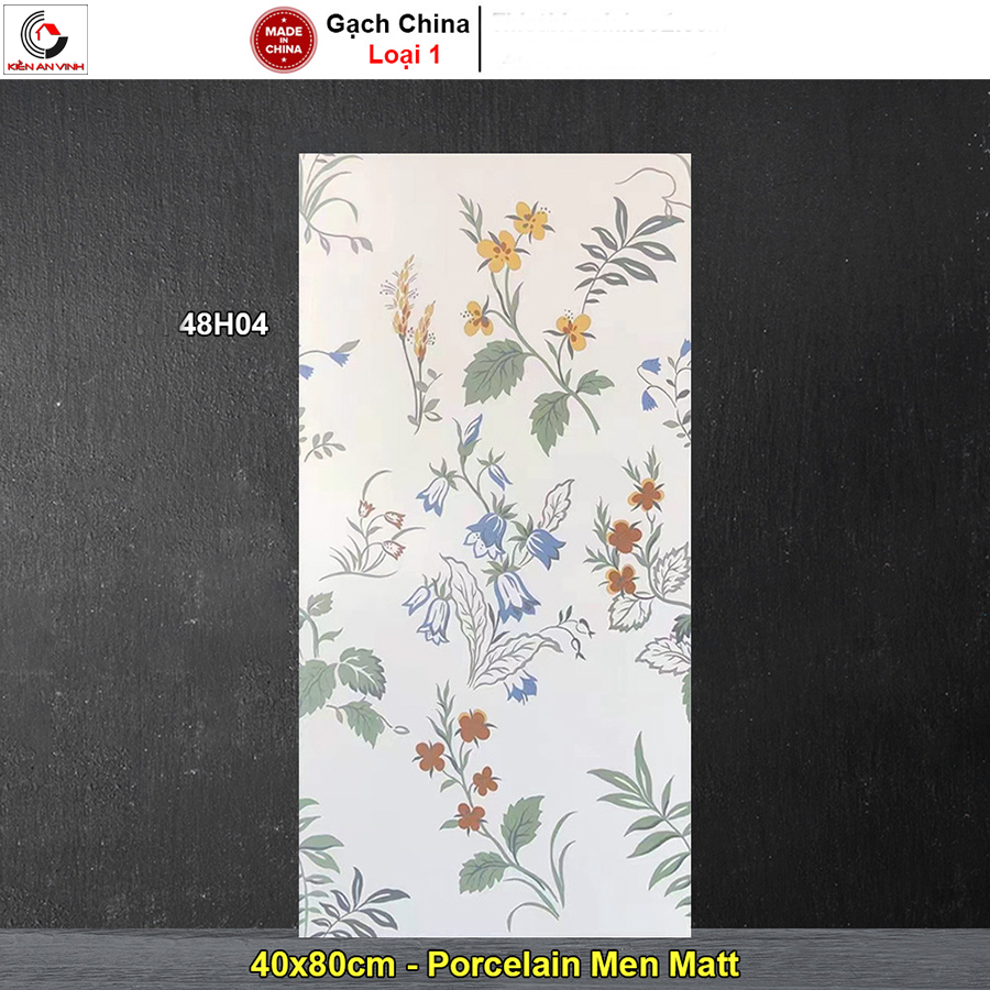 Mẫu gạch 48H04 là dòng gạch ốp tường trang trí cao cấp, nhập khẩu từ Trung Quốc (Loại 1). Gạch này nổi bật với họa tiết hoa chuông, lá cây đa sắc trên nền trắng/kem sáng, mang lại vẻ đẹp tươi mới, cổ điển lãng mạn (Vintage) hoặc đồng quê (Cottage).
