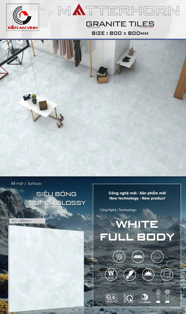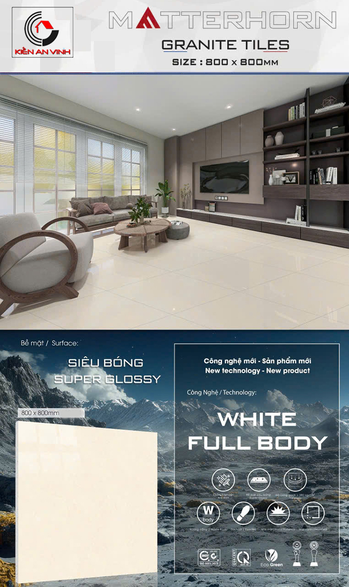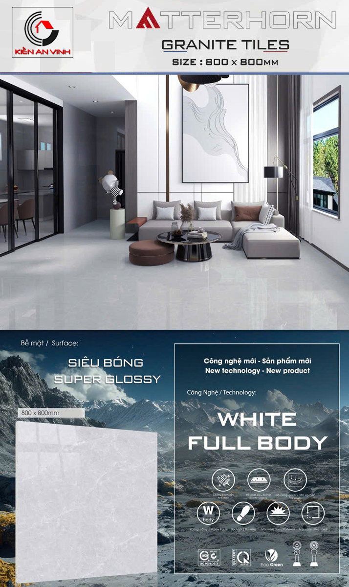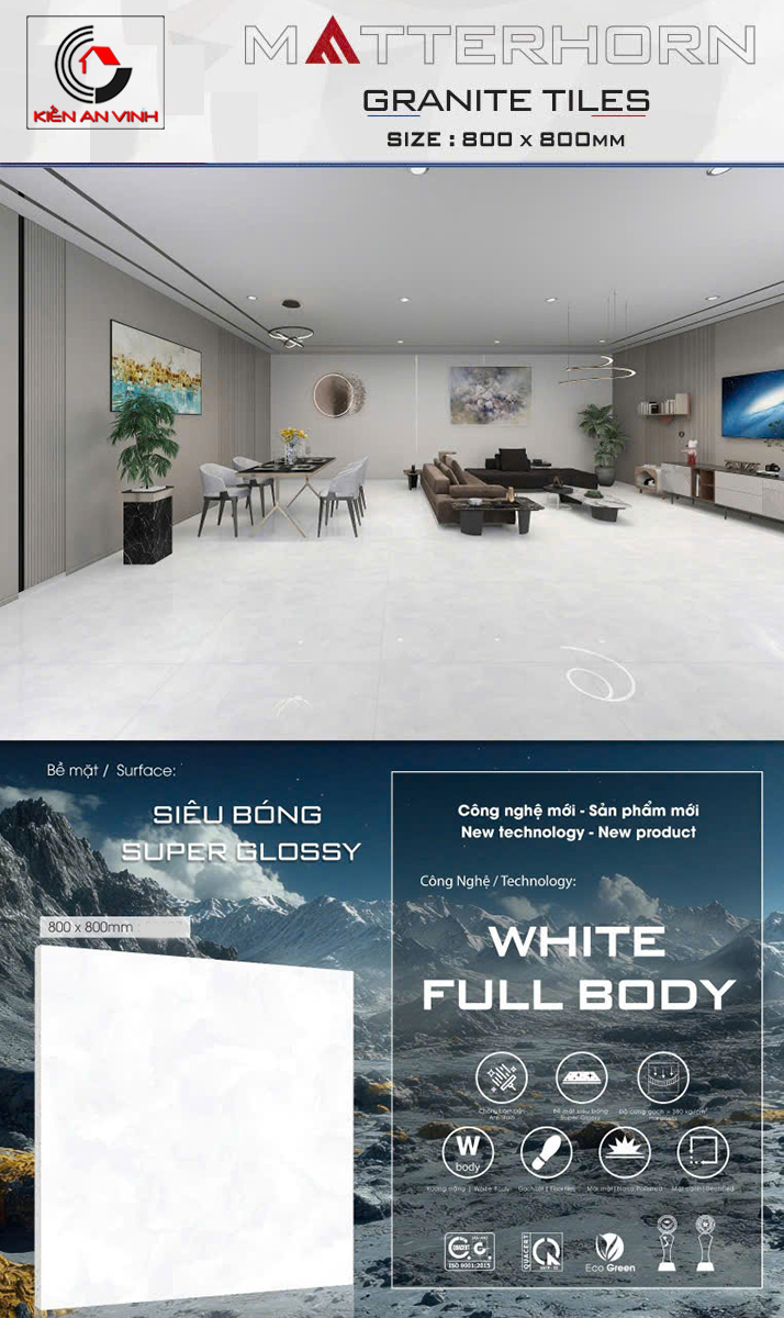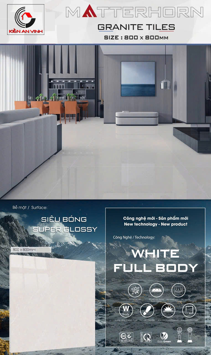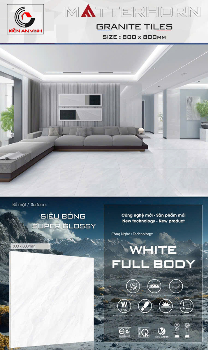Khi lựa chọn gạch lát nền và ốp tường, yếu tố chất lượng, thẩm mỹ lẫn hiệu năng sử dụng luôn được đặt lên hàng đầu. Gạch lát sàn Granite 80x80cm cao cấp được sản xuất bằng công nghệ Full Body (đồng chất) có bề mặt siêu bóng trắng sáng, chống trầy xước, chống mài mòn, chống trượt và thân thiện với môi trường, chính là lựa chọn tối ưu dành cho mọi công trình muốn tạo dựng dấu ấn sang trọng, hiện đại lâu dài.