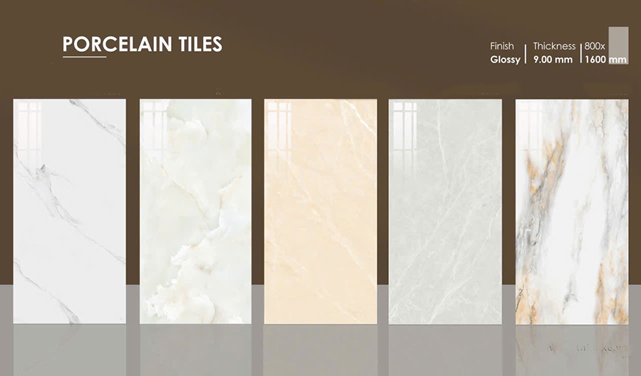 Hình ảnh 5 mẫu gạch dưới đây mô tả một loạt mẫu gạch khổ lớn thuộc dòng PORCELAIN TILES. Dòng gạch này đại diện cho phân khúc cao cấp nhất hiện nay, được sử dụng phổ biến để lát nền và ốp tường các không gian sang trọng như sảnh khách sạn, biệt thự, hoặc căn hộ penthouse.