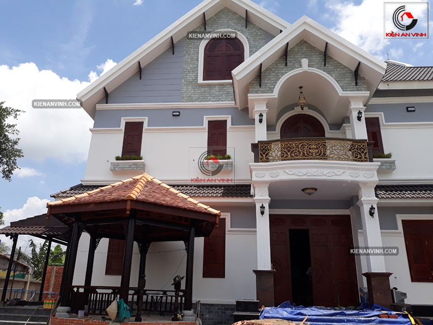 Thi công biệt thự mái thái 2 tầng 8x18m tân cổ điển pha hiện đại kết hợp quán cafe sân vườn ở Đức Hòa