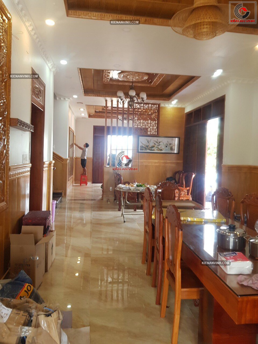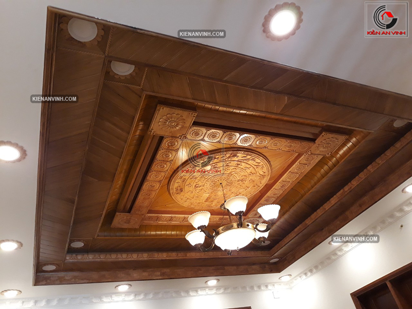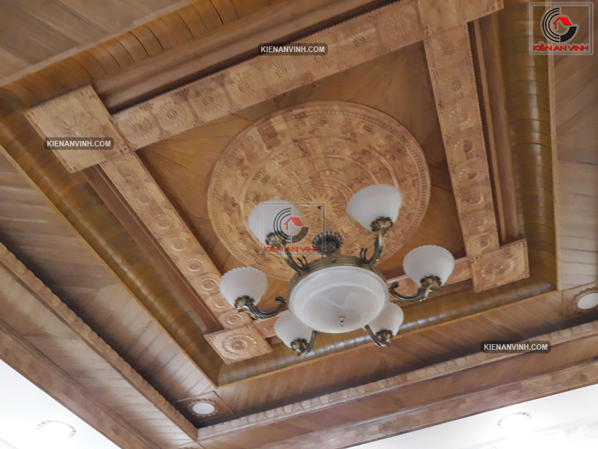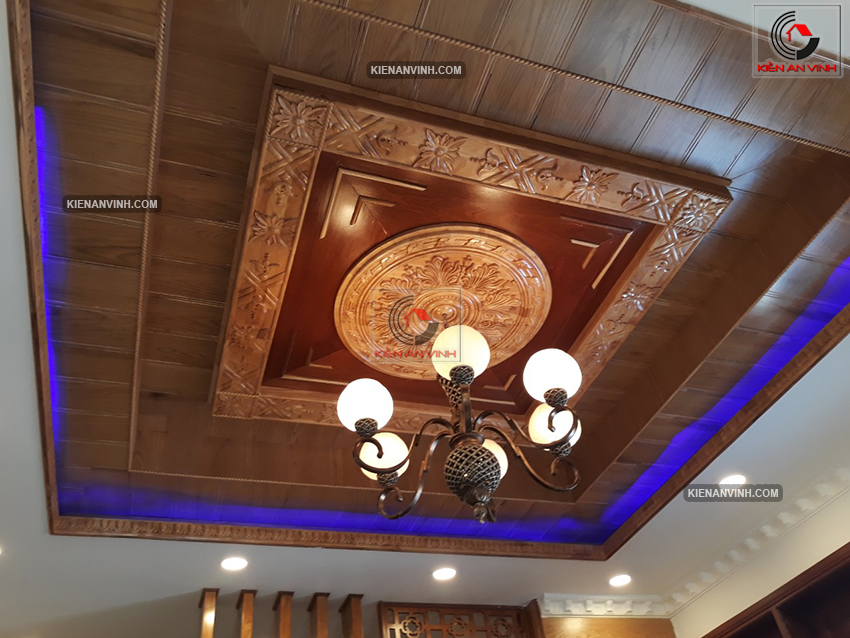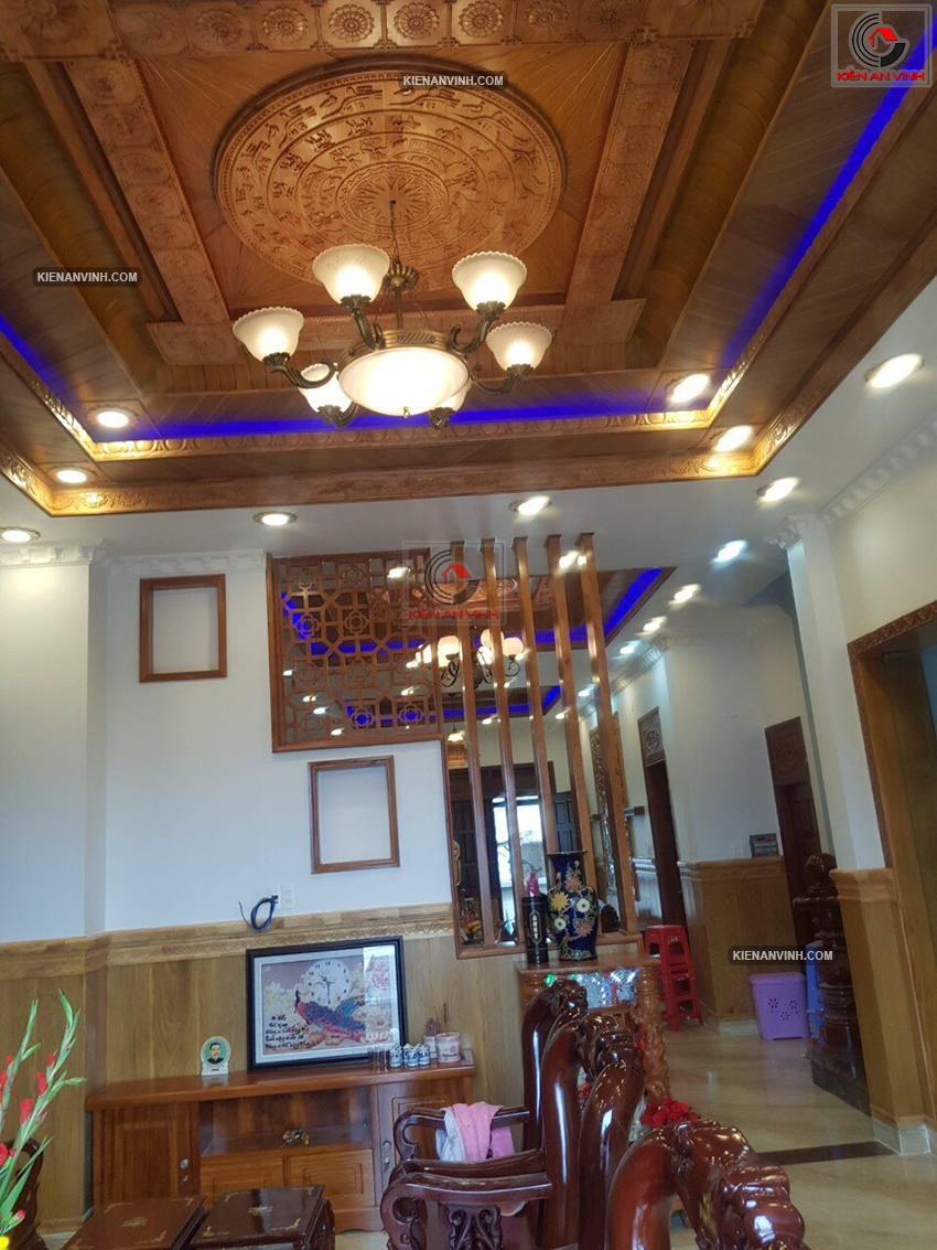 Trần nhà ốp gỗ đỏ tự nhiên vừa tạo điểm nhấn đặc biệt cho phòng khách và phòng thờ, vừa giúp cách âm, cách nhiệt hiệu quả. Màu gỗ nâu trầm làm nổi bật tính truyền thống mà vẫn hài hòa với các yếu tố hiện đại khác trong nội thất.