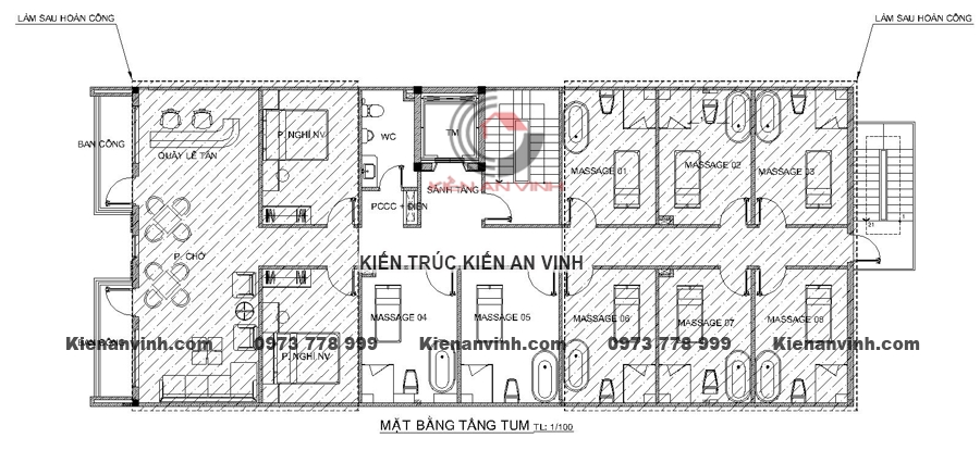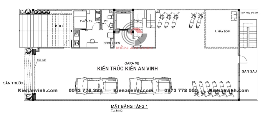 Công năng tiện ích Tầng trệt: gara ô tô, khu lễ tân, sảnh chờ, kho và khu kỹ thuật.