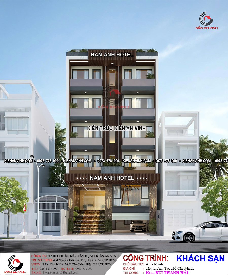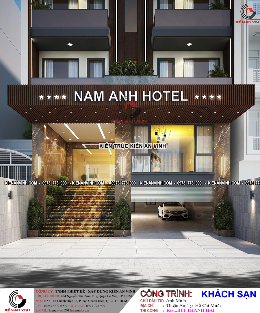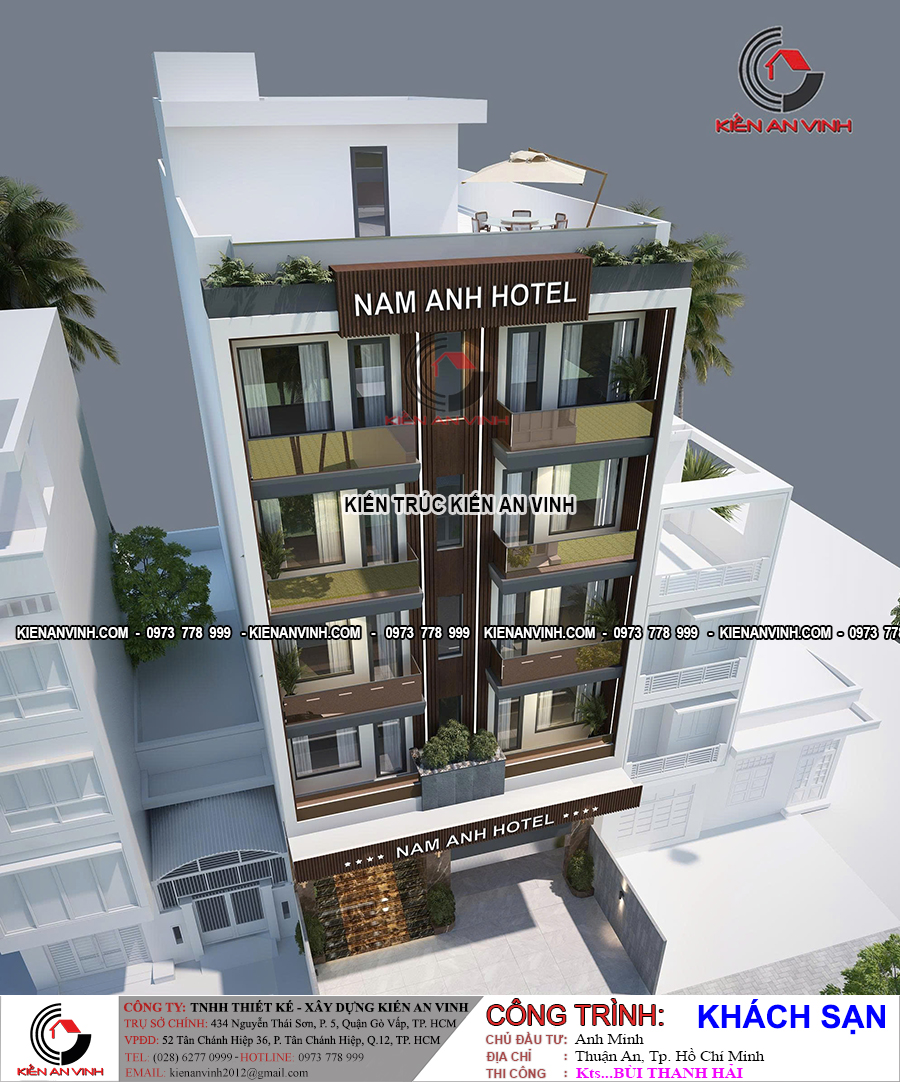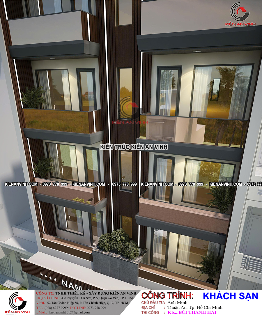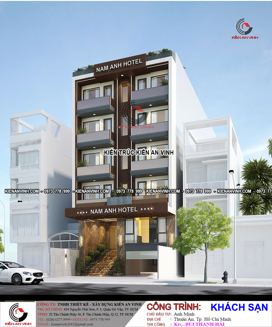Mẫu khách sạn Nam Anh 5 tầng 1 tum 10x22m mang vẻ đẹp hiện đại, trang nhã và chuyên nghiệp, phù hợp cho các khu đô thị sầm uất như Thuận An (Bình Dương) hoặc TP.HCM