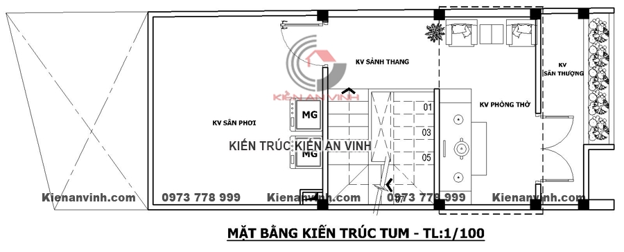 Tầng tum được thiết kế mở với sân thượng xanh giúp cơ cấu thêm khu vực thư giãn, sân phơi đồ, tạo ra không gian xanh nhỏ ngay trên mái, vừa giải trí, vừa làm tăng giá trị thẩm mỹ cho ngôi nhà.
