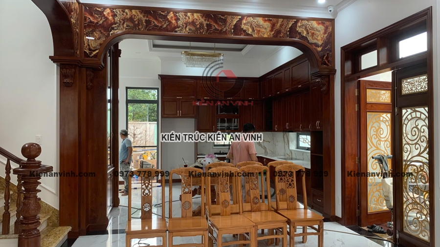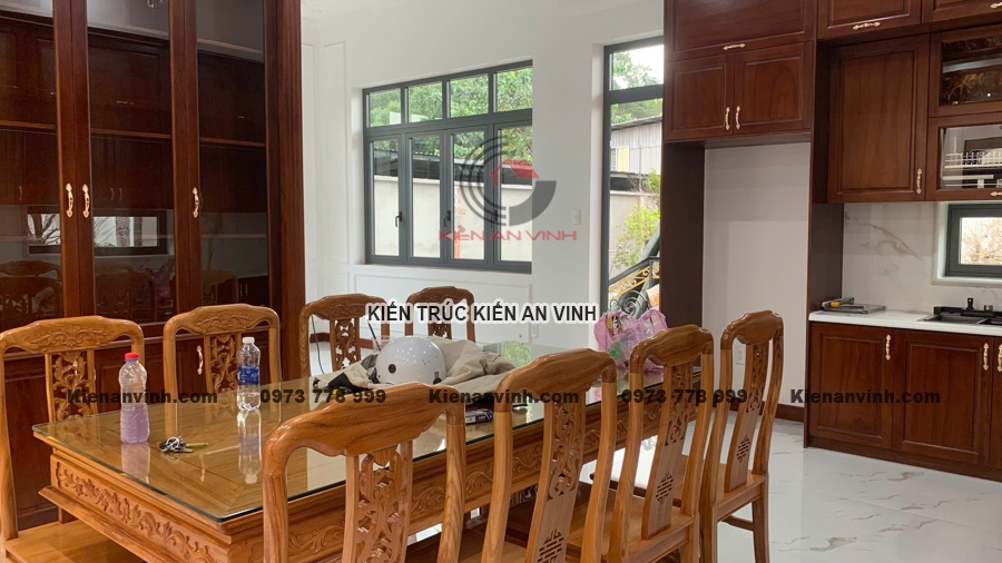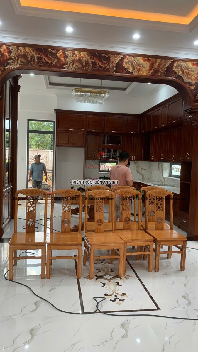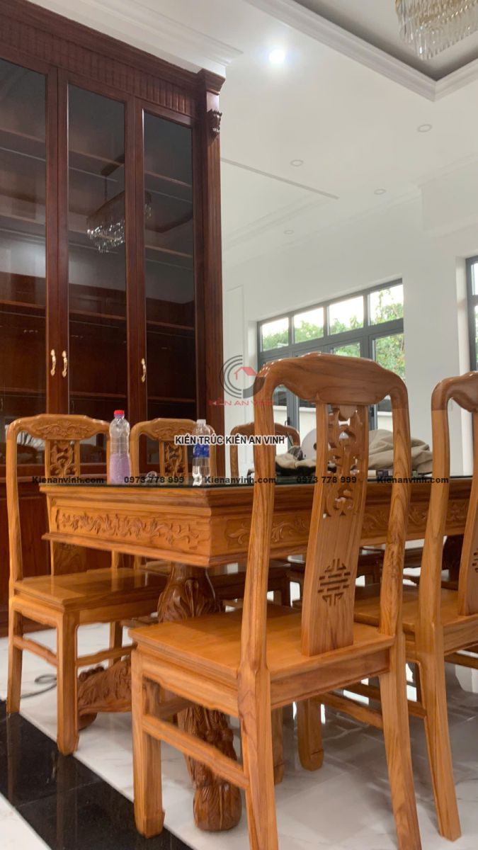 Khu vực ăn và bếp biệt thự: Ấm cúng, kết nối với bàn ăn gỗ chạm khắc tinh xảo