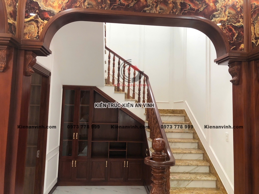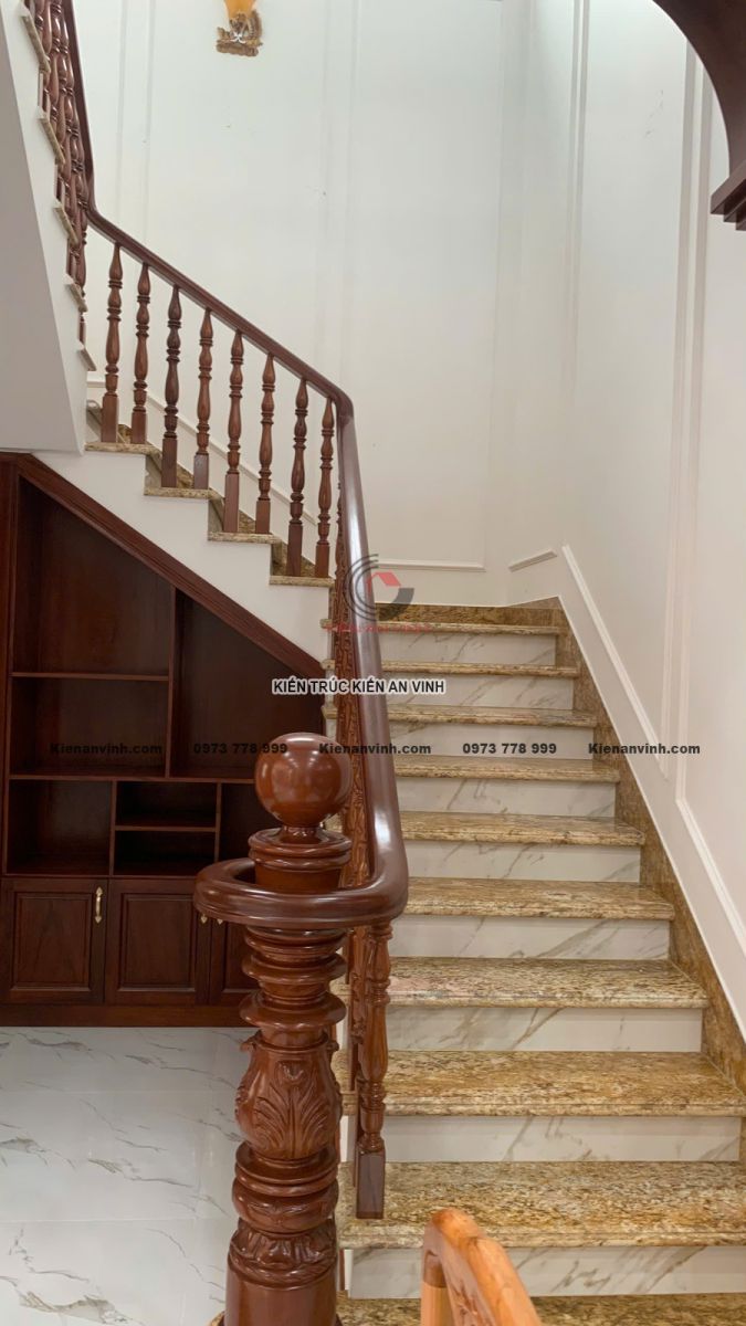Thang và sảnh tầng biệt thự: Nghệ thuật trong từng chi tiết với lan can gỗ và đá hoa cương