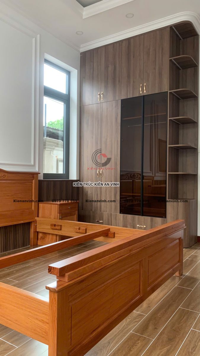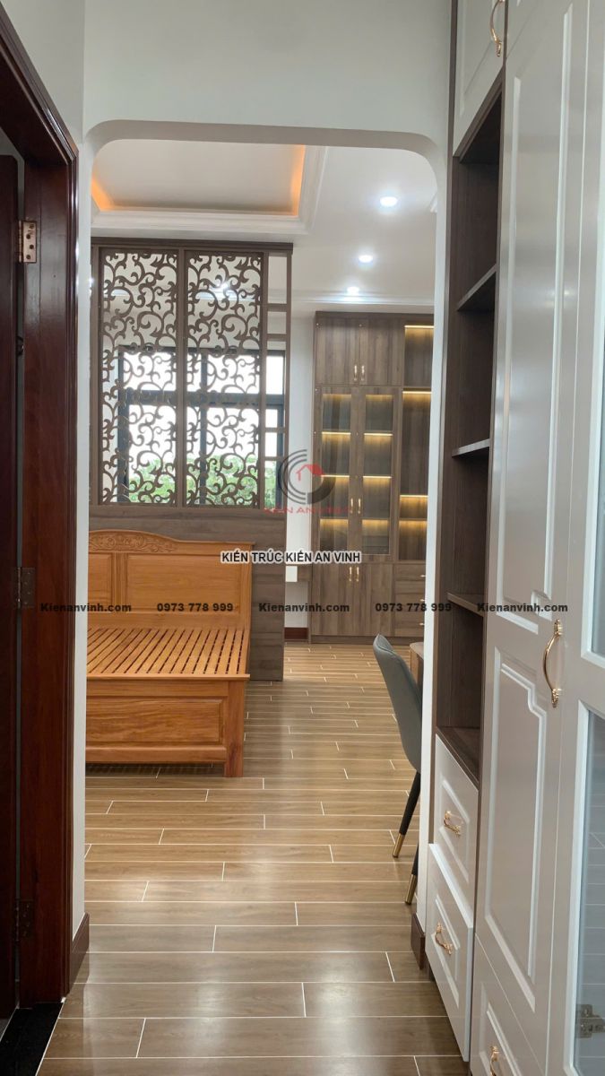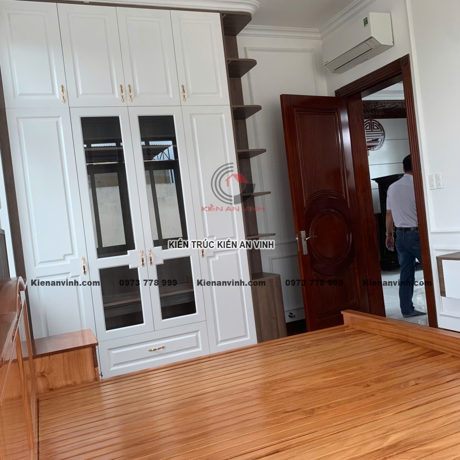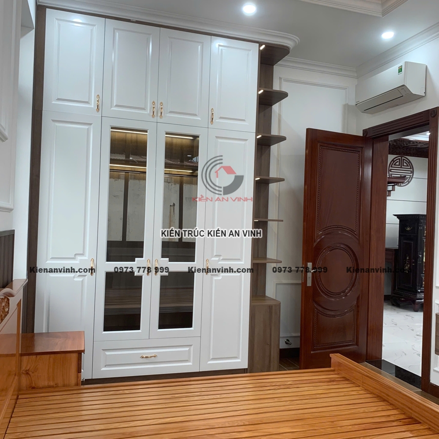 Tủ áo âm tường được thiết kế khoa học, phối màu trắng – nâu nhẹ nhàng cùng phào chỉ tinh tế hòa quyện giữa nét cổ điển và hiện đại. Sự bố trí âm tường vừa tiết kiệm diện tích vừa đảm bảo tính thẩm mỹ.