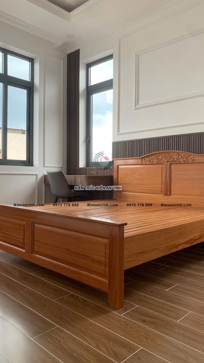 Giường ngủ làm từ gỗ tự nhiên có kích thước lớn, chân giường và đầu giường thiết kế đơn giản nhưng tinh tế. Màu vàng ấm của gỗ giúp không gian phòng trở nên dịu dàng, ấm áp, tạo cảm giác an yên tối đa.