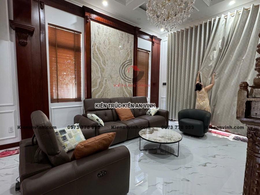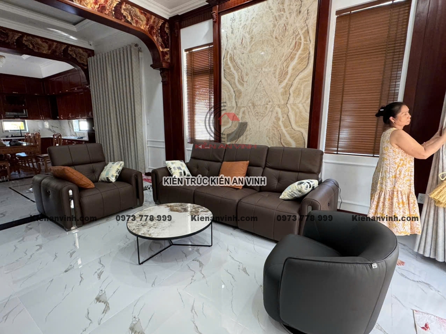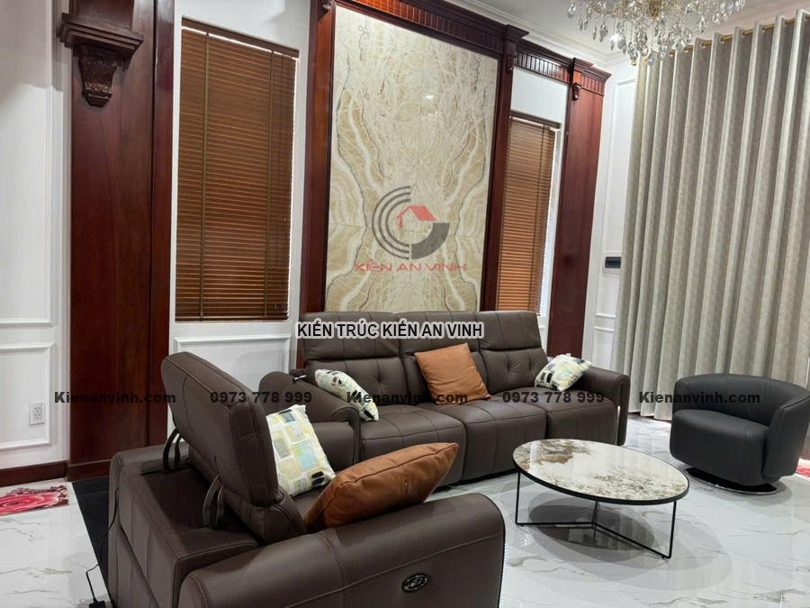 Phòng khách biệt thự: Điểm nhấn sang trọng với sofa da cao cấp và đá tự nhiên vân đối xứng