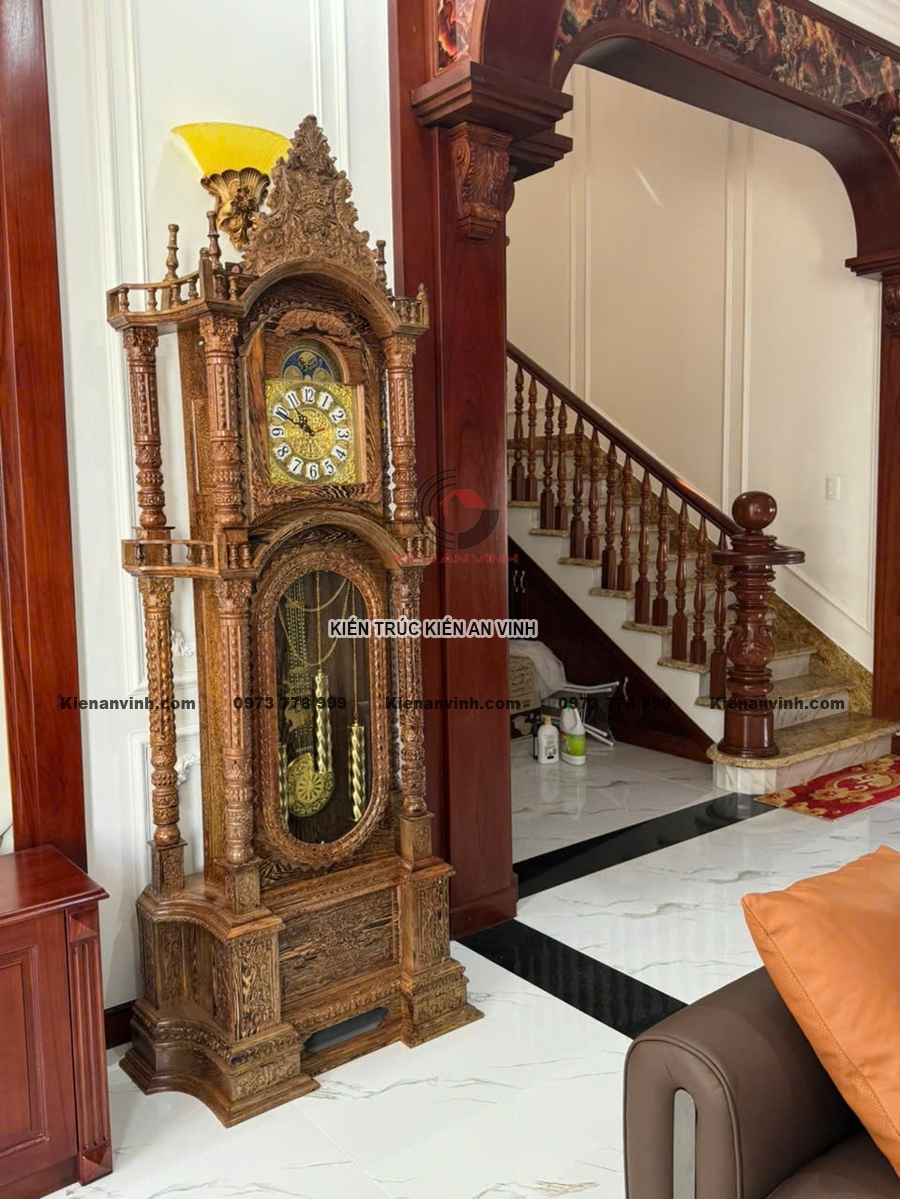 Án gian thờ làm bằng gỗ tự nhiên dày dặn, được chạm trổ tinh xảo các họa tiết truyền thống như rồng phượng, hoa lá cách điệu tạo nên sự trang trọng và uy nghiêm. Mặt gỗ được xử lý kỹ thuật đảm bảo không bị mối mọt và giữ màu bền đẹp qua năm tháng.