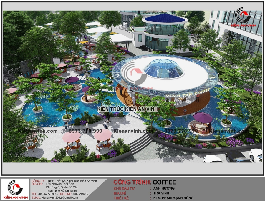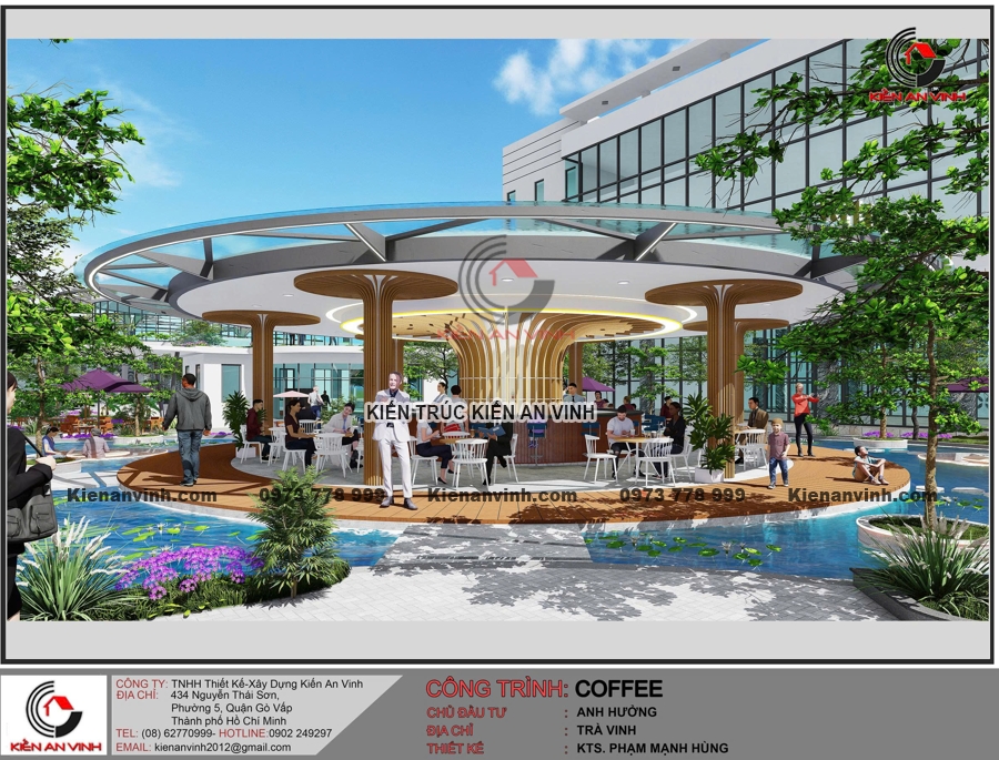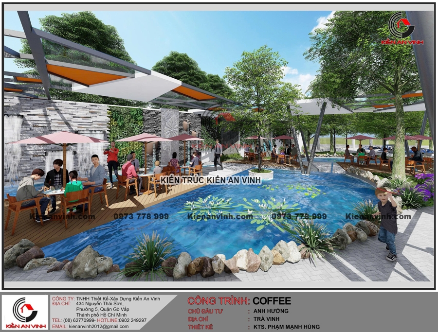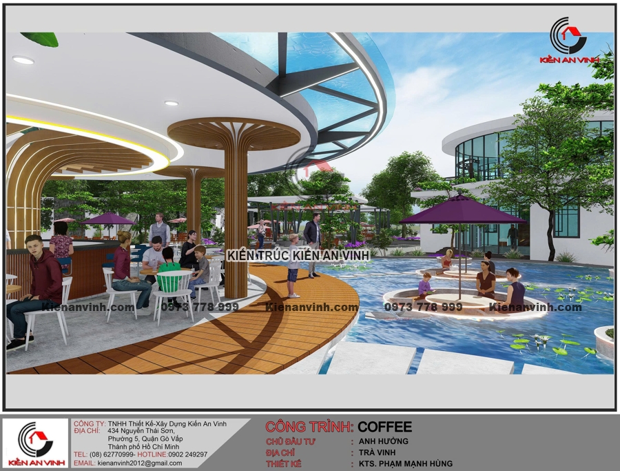 Hồ cảnh quan uốn quanh khu cafe với cây thủy sinh, tiểu đảo và cầu gỗ tạo nên khung cảnh thơ mộng, thư thái như một công viên sinh thái thu nhỏ. Hồ nước không chỉ mang đến sự sinh động mà còn giúp điều hòa nhiệt độ, làm sạch không khí, tăng sự an nhiên cho suốt quá trình thưởng thức cafe.